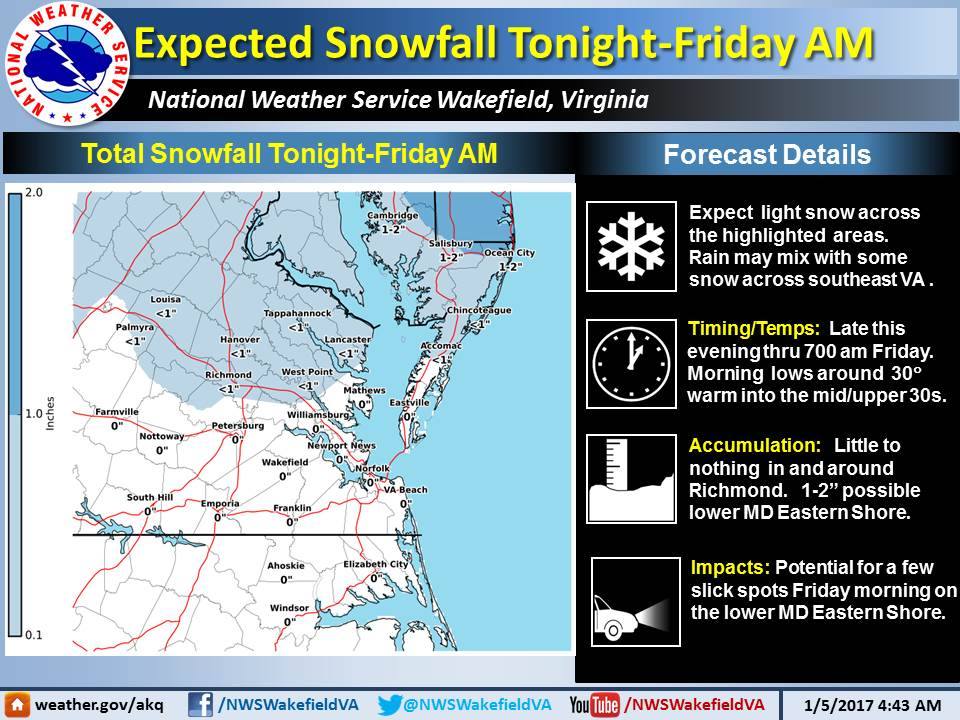 | Posted: 05 Jan 2017 02:30 AM PST Here is our latest thinking regarding snow forecasts Friday morning and again on Saturday. Up to 1 to 2 inches of snow is possible across the lower MD Eastern Shore Friday morning with little to no accumulation expected as far south as Richmond and the Tri-Cities. The more significant event hits the region early Saturday morning lasting though the day. With cold temperatures in place snow will be quick to accumulate. The hardest hit areas look to be across northeast NC, Hampton Roads, Tidewater and south Central VA. Based on the current expected storm track, accumulations have been increased this morning across southeast VA and northeast NC. Get the latest forecast information at http://www.weather.gov/akq/winter and http://www.weather.gov.akq/RainandSnow. | ||||||||||